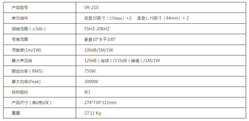 VR-210全頻箱配置的是2個(gè)10寸紙盆釹磁低音揚(yáng)聲器和2個(gè)1寸高音驅(qū)動(dòng)器。裝于10寸箱體前部的壓縮腔相位塞(compression chamber phase plug) 防止低頻段由于梳狀濾波產(chǎn)生干涉, 化了低頻指向性。結(jié)合在兩個(gè)高音驅(qū)動(dòng)器和1個(gè)超高音驅(qū)動(dòng)器間經(jīng)過耦合的優(yōu)化波形生成器,形成一個(gè)10°的垂直波面,生成非常厚實(shí)的低頻和明亮的高音。