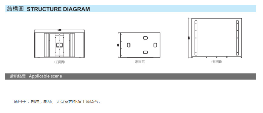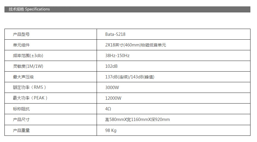 音箱箱體采用樺木夾板材料,采用環(huán)保型水性漆。音箱正面安裝了堅(jiān)固的金屬防護(hù)網(wǎng)罩,內(nèi)襯透聲吸音棉。BATA-S218的側(cè)面板都包含四個(gè)把手,而四個(gè)車(chē)輪安裝在音箱后部。箱體底部設(shè)有兩根墊條,用于防護(hù)底板免遭刮擦。音箱頂板上兩條對(duì)應(yīng)形狀的凹槽就是用來(lái)容納音箱底部的墊條,以便堆疊使用時(shí)避免箱體移動(dòng)。