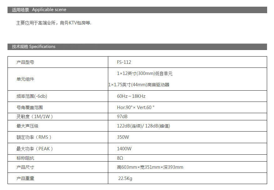 FS-112 是專為KTV應(yīng)用而設(shè)計的全頻揚聲器,它配備了大功率、*能的低音單元,和1.75寸的鈦振膜高音壓縮驅(qū)動器。特別設(shè)計的對稱單后置通風(fēng)對流孔散熱設(shè)計,結(jié)合高靈敏度的大功率低音單元,保證在大功率情況下、長時間能夠穩(wěn)定使用,F(xiàn)S系列具有后置出氣孔設(shè)計的增強低頻效果,同時具有前置出氣孔箱體設(shè)計的中頻靠前的風(fēng)格特性,克服了傳統(tǒng)后置出氣孔揚聲器中頻靠后和凹陷的問題,讓系統(tǒng)更容易輕松“入咪”。*1.75寸鈦振膜高音壓縮驅(qū)動器加上針對室內(nèi)近距離演唱設(shè)計的高頻號角,減小了對高頻信號的壓縮失真,使高頻細膩柔順,無論水平或垂直擺放,身處房間任何位置,都可以欣賞到一致均衡的聲音效果。